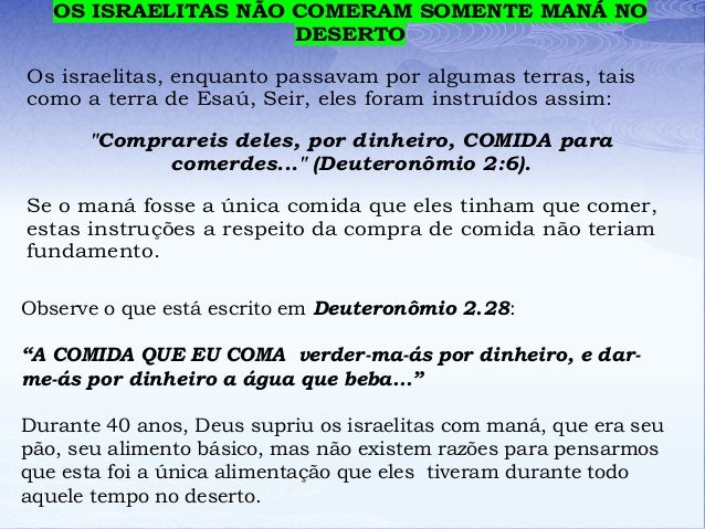 - Os israelitas, enquanto passavam por algumas terras, tais como a terra de Esaú, Seir, eles foram instruídos assim: "Comprareis deles, por dinheiro, COMIDA para comerdes..." (Deuteronômio 2:6). Se o maná fosse a única comida que eles tinham que comer, estas instruções a respeito da compra de comida não teriam fundamento. Observe o que está escrito em Deuteronômio 2.28: “A COMIDA QUE EU COMA verder-ma-ás por dinheiro, e darme-ás por dinheiro a água que beba...” Durante 40 anos, Deus supriu os israelitas com maná, que era seu pão, seu alimento básico, mas não existem razões para pensarmos que esta foi a única alimentação que eles tiveram durante todo aquele tempo no deserto.